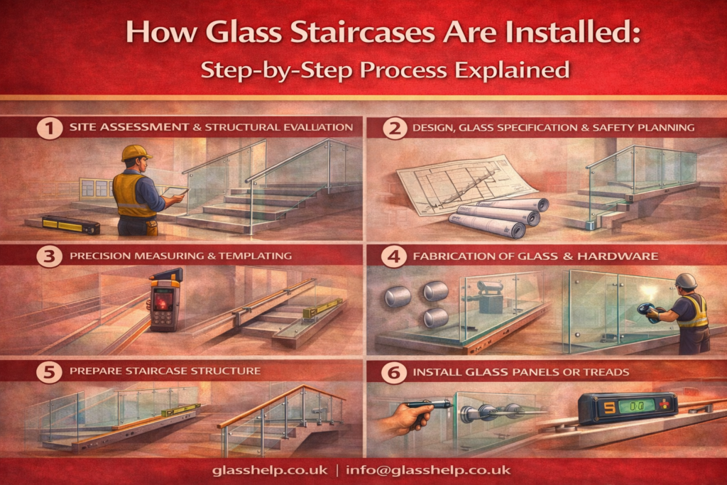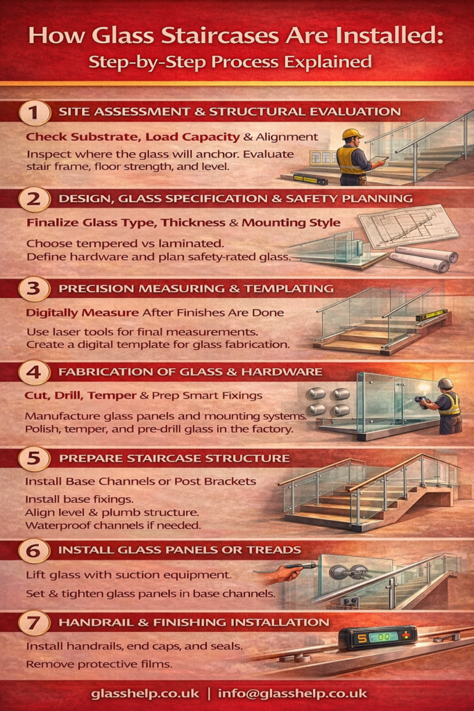 Glass staircases look effortless once installed — clean lines, floating steps, and uninterrupted light. But behind that sleek finish is a highly technical installation process that demands precision, planning, and strict safety compliance.