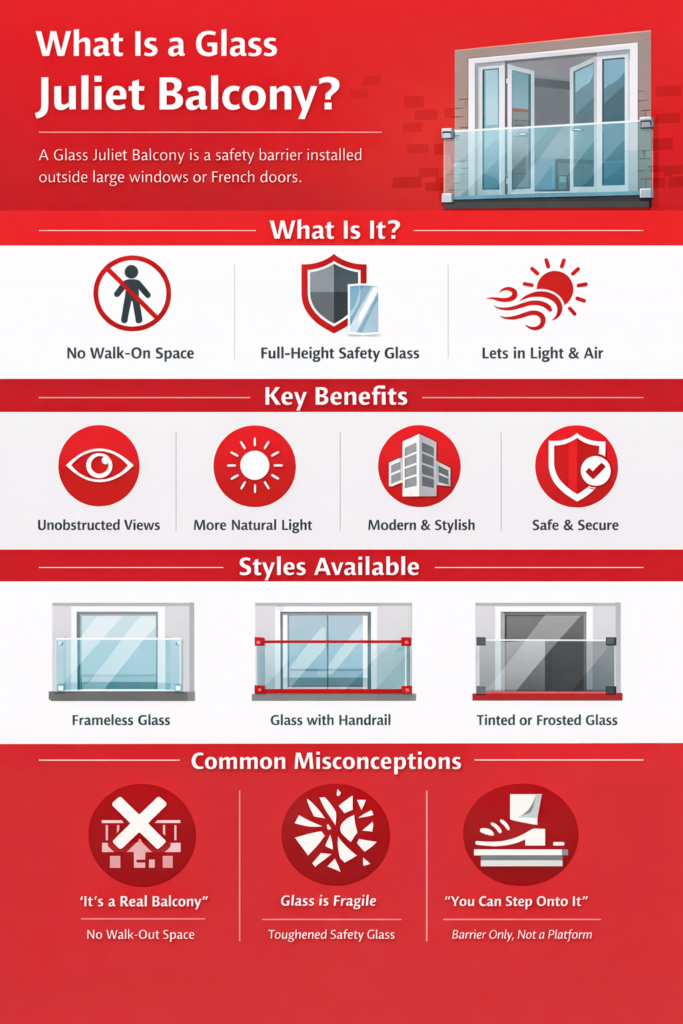 A glass Juliet balcony is a fixed safety barrier made primarily from laminated safety glass. It is installed externally in front of full-height windows or doors, allowing them to open safely without the need for a walk-out platform.