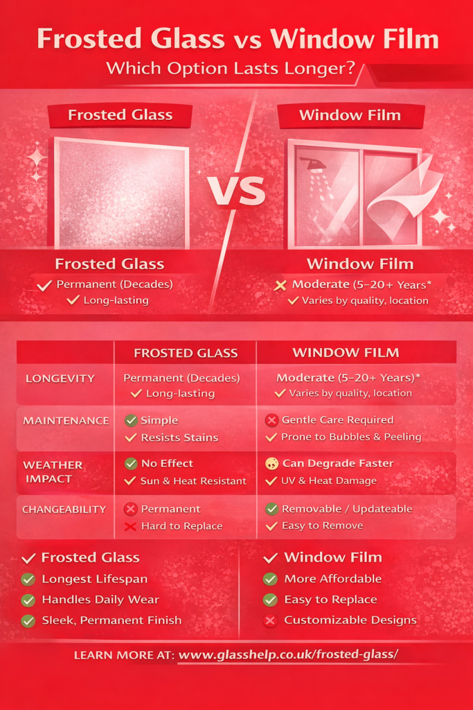 When comparing frosted glass vs window film for longevity, frosted glass usually wins the durability battle thanks to its permanent, integrated finish. However, modern window films — especially high-quality professional options — can still offer many years of reliable service when installed and cared for properly.