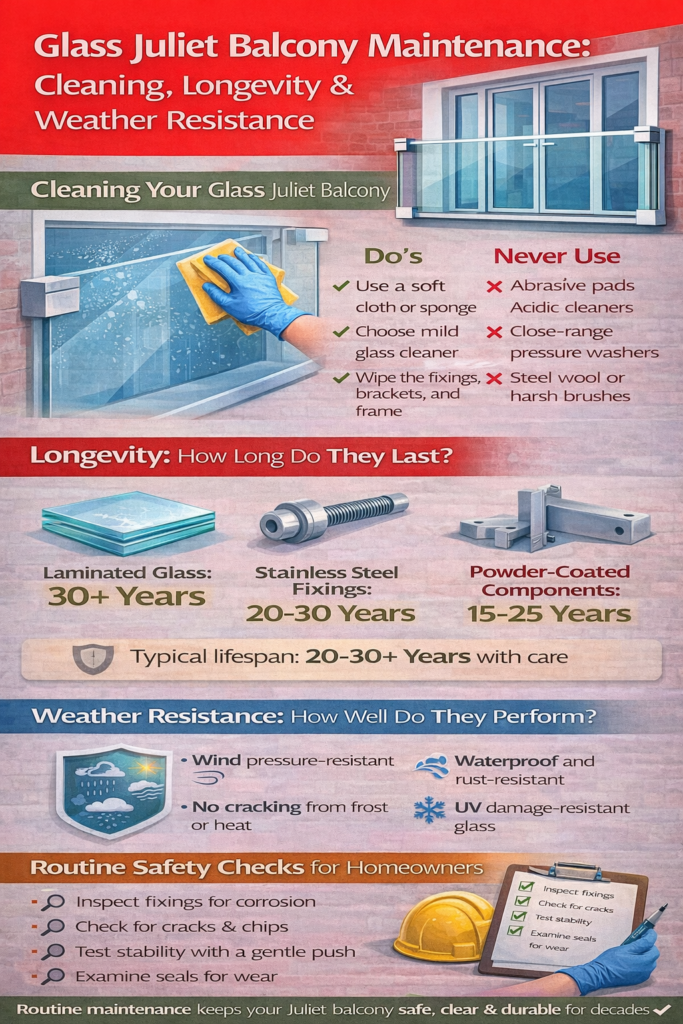 Glass Juliet balconies are one of the lowest-maintenance external safety features available for modern homes. With basic cleaning and occasional checks, they remain safe, clear, and visually striking for decades.
