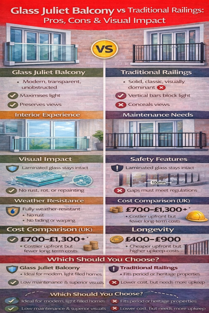 Glass Juliet Balcony vs Traditional Railings: Pros, Cons & Visual Impact