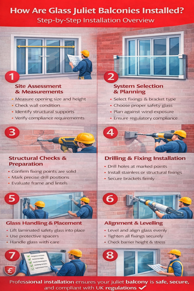Glass Juliet balconies may appear simple, but their installation is a precise, engineered process designed to protect people at height.