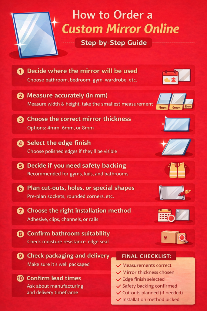 Ordering a custom mirror online doesn’t have to be risky. By following these steps and confirming the right details upfront, you’ll avoid common mistakes and get a mirror that fits perfectly, looks professional, and lasts for years.
