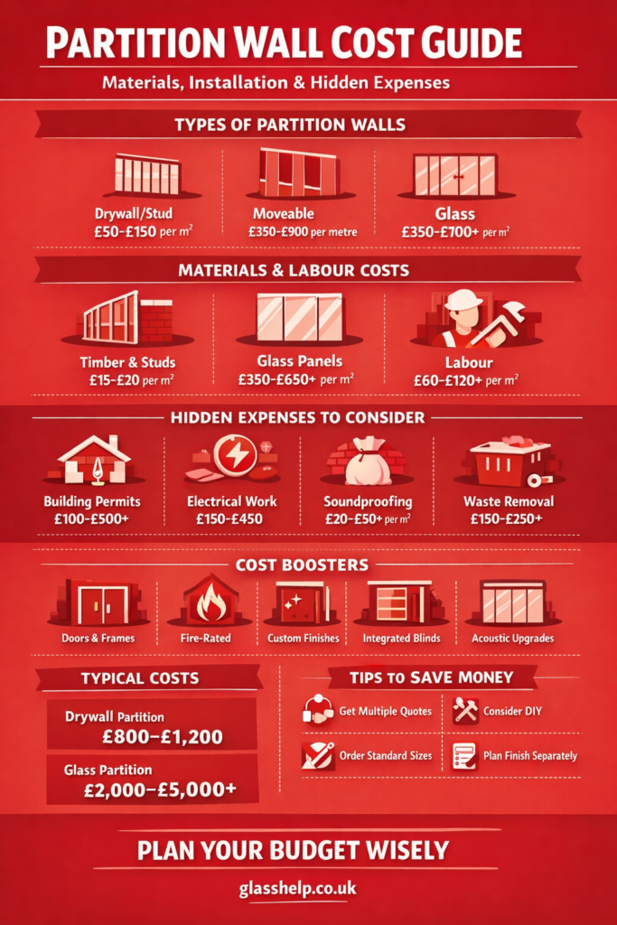• Typical Cost: £50 – £150 per m² installed (varies by finish and insulation) partitionwallcompany.co.uk