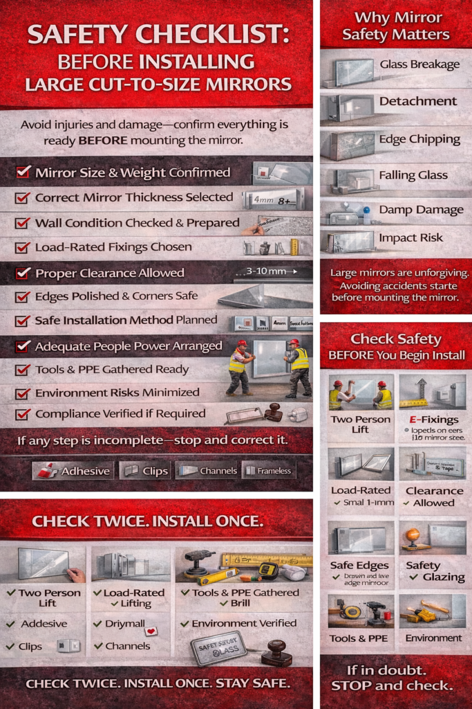 Large cut-to-size mirrors can transform a space—adding light, depth, and a clean, architectural look. But they also introduce real safety risks if installed incorrectly. Unlike small decorative mirrors, large mirrors are heavy, rigid, and unforgiving. A single mistake during installation can lead to glass failure, wall damage, or serious injury.